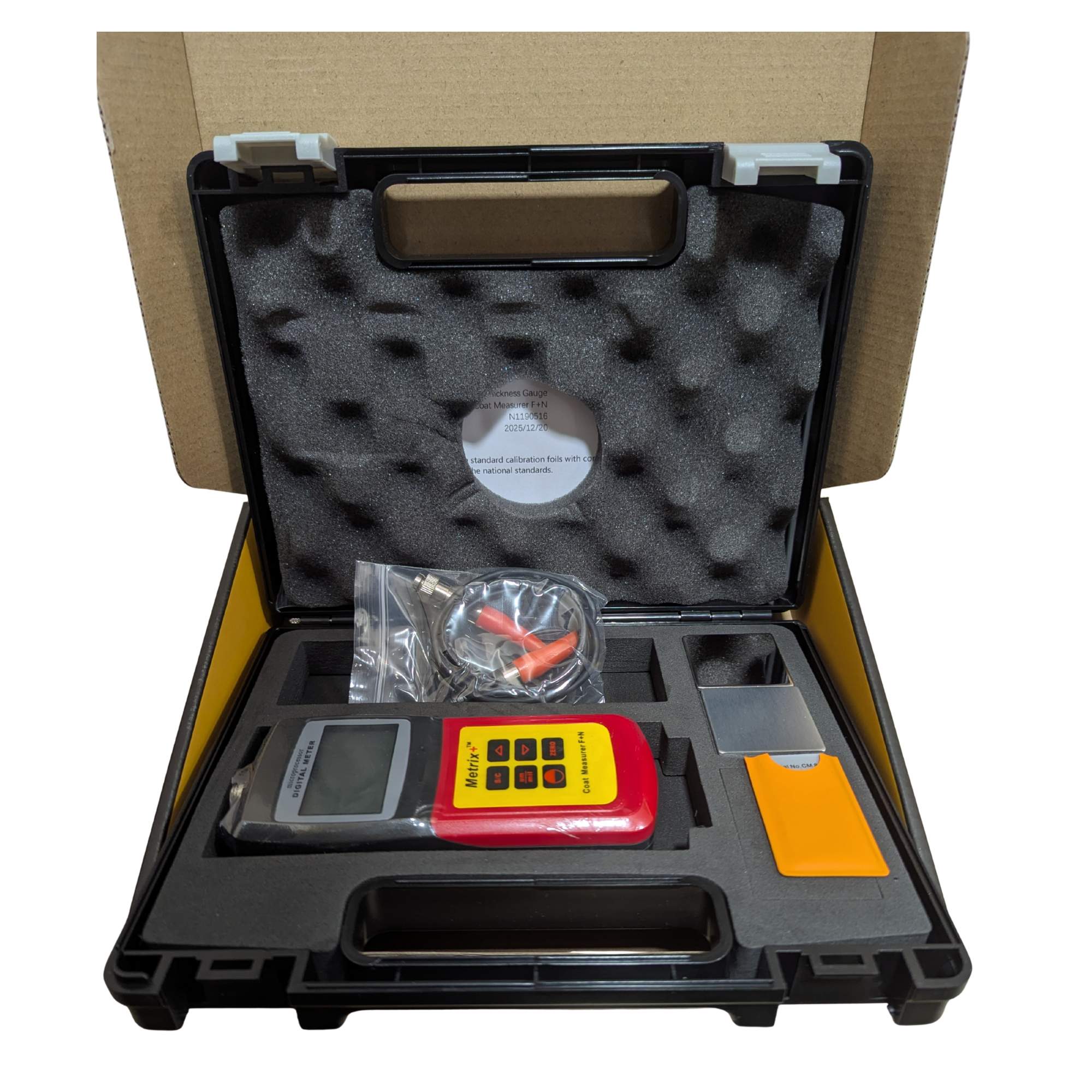 Coating Thickness Gauge, F/nF probe,  ‘0’ calibration block, standard foils, batteries, technical manual, hard carry case.